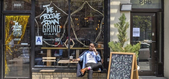 Featuring a "Subway car" design, this South Bronx coffee shop hosts free community events to showcase local artists and represents a big effort in an area with few Open Restaurants.