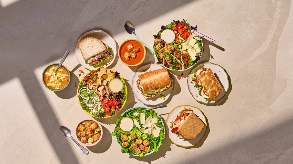 - The menu offers half- and cup-sized portions of 10 soups, salads and sandwiches, as well as rotating seasonal items. Guests also receive a baguette, chips or apple as a side.