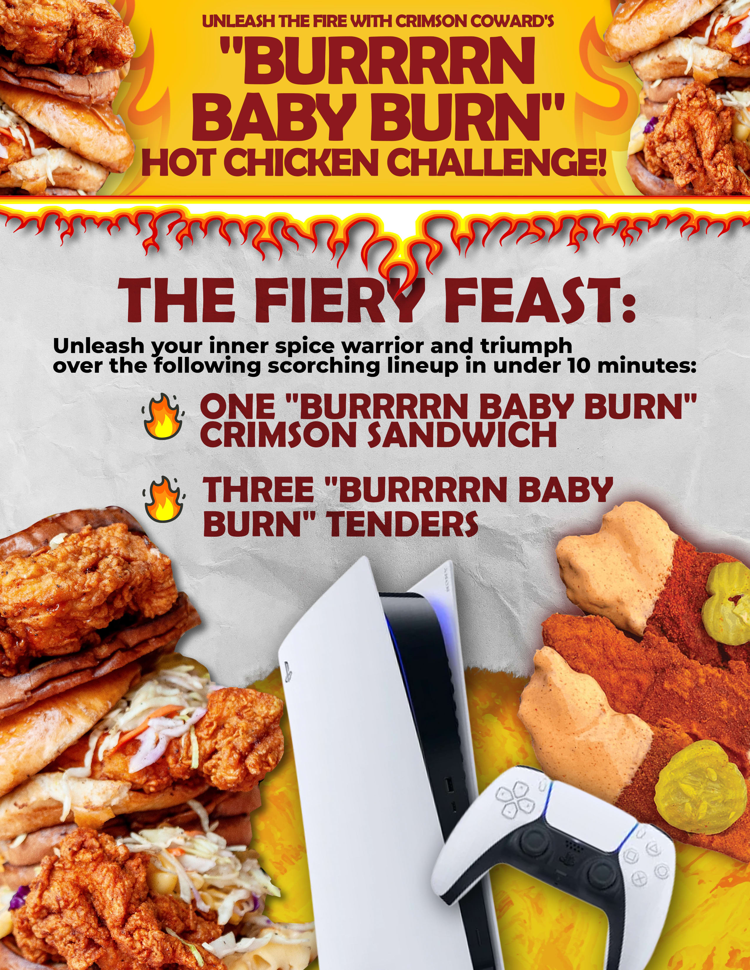 - Blaze into Action: Arrive at Crimson Coward on your chosen challenge day and boldly declare your intent to conquer the "BURRRRN BABY BURN" Hot Chicken Challenge.